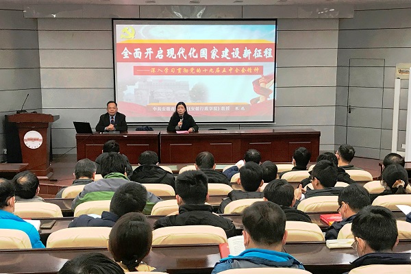 为进一步增强教职工的政治定力,切实将思想和行动统一到党的十九届五中全会精神上来,12月10日下午,威尼斯9499登录入口在斛兵报告厅举行十九届五中全会精神学习专题报告会。中共安徽省委党校决策咨询部主任、省委党校党的建设与国家治理研究院执行院长张彪教授应邀作了题为“全面开启现代化国家建设新的征程——深入学习党的十九届五中全会精神”专题宣讲。全院教职工、部分学生党员干部参加学习。