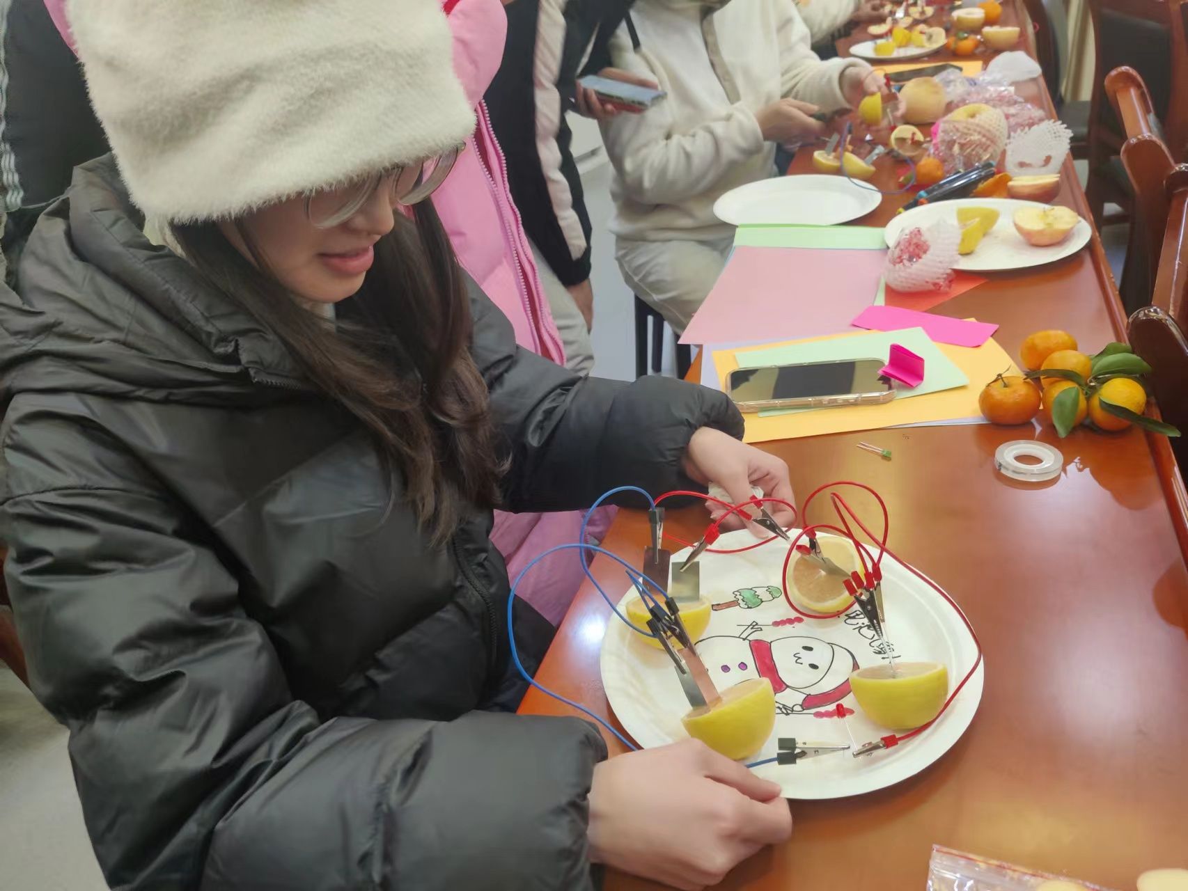 比赛开始,主持人向选手们讲述了比赛规则,参赛团队需在规定的一小时内,根据主办方提供的水果、彩纸、贺卡、灯泡等素材现场制作水果电池。评委将会根据电池设计理念、电池质量(包括电压、亮度等)、美观度等情况进行打分。