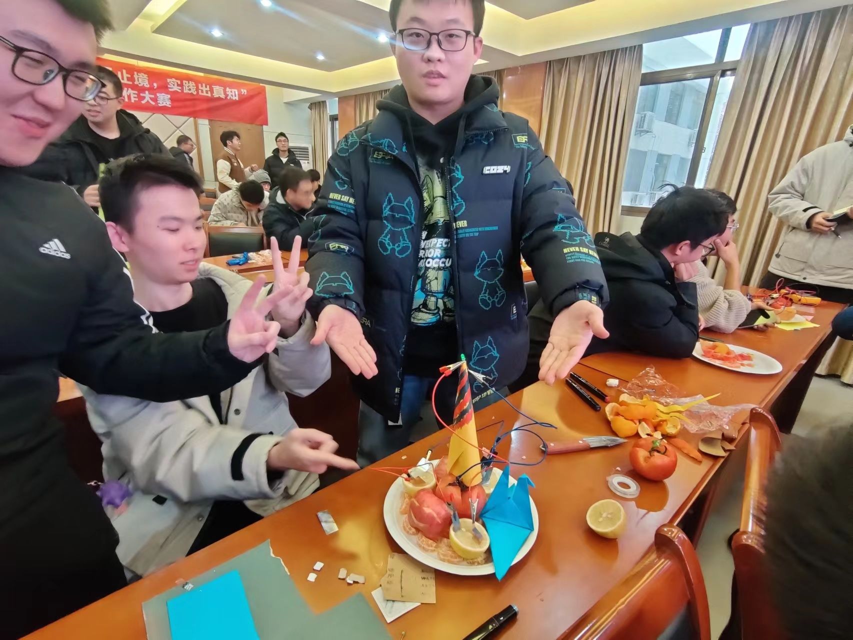 经过报名筛选,共有来自威尼斯9499登录入口和化工学院的20余支队伍参加。现场气氛欢快热闹,每支队伍都在构思自己的设计理念和原理,互相阐述着属于自己的理解,从橘子、柠檬、西红柿到梨子,从铜片、铝片、导线到彩纸,水果电池的结构逐渐清晰。在最终展示环节,参赛队伍纷纷阐述了各自电池的设计理念和独特寓意。评委团对每支队伍进行了电池知识的问答,参赛团队在问答中互相学习,共同掌握电池相关知识点,真正实现了实践创新与理论学习的有效结合。