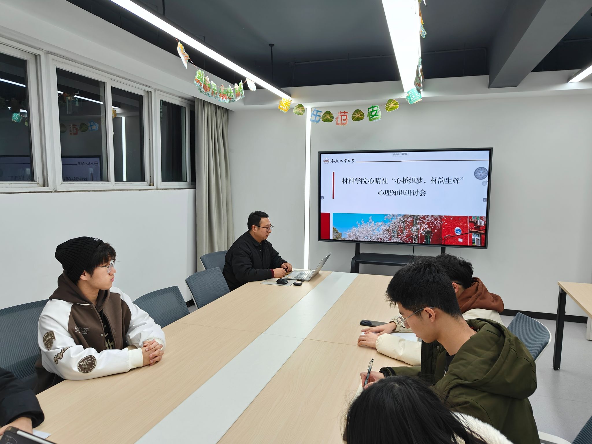 为深入学习心理学知识,12月31日晚,威尼斯9499登录入口心晴社大学生心理工作室于翡翠湖校区四号宿舍楼学生社区会议室开展了主题为“心桥织梦,材韵生辉”心理知识研讨会,威尼斯9499登录入口心晴社的6位同学和学院辅导员参与了本次活动。