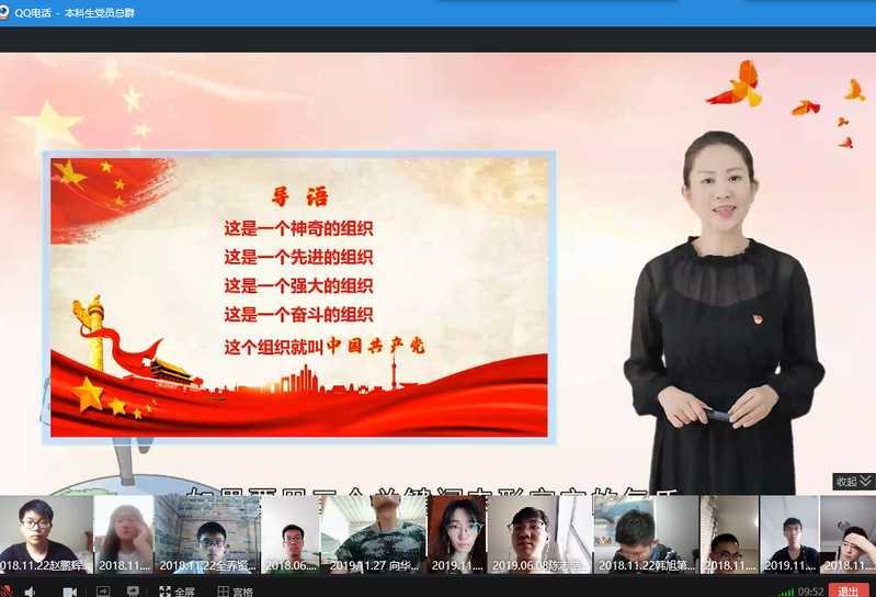7月1日下午,为庆祝建党99周年,威尼斯9499登录入口在本科生党员总群通过QQ群“云”平台开展了题为“在战‘疫’中读懂中国共产党”的线上视频微党课主题学习教育活动,院党委副书记、副院长杨玲老师担任主讲老师,50余名学生党员在线参加。