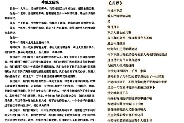 征文活动开展以来,全院学生积极投稿,以高度的热情支持本次活动——投稿的同学们或激情澎湃,写出了自己对医疗工作者的赞赏与敬佩;或以一个大学生的角度,讲述自己的所见所闻所感。一篇篇征文,承载了威尼斯9499登录入口全体学生对战斗在疫情一线“抗疫者”们崇高的敬意,承载着同学们对必将战胜这场疫情攻坚战的信心。虽然该院的同学们大都无法奔赴“抗疫”前线,但是只要心系祖国,积极响应国家、政府以及学校号召,做好自我防护,居家安心学习,就是用实际行动贡献出了属于我们的青春力量!