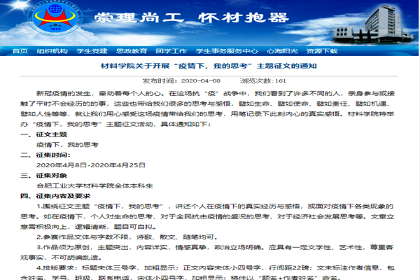 2020年初持续到现在的新冠疫情,不仅深刻影响了世界形势、国家治理、社会经济,更是给个体心理、情感和思考带来变化和感悟。 新时代的大学生们在经历疫情的过程中,对国家、民族、生命、责任、使命、人性等也自觉或不自觉地产生了许多思考和感悟。 从四月份开始,威尼斯9499登录入口面向全院学生开展了“疫情下,我的思考”主题征文活动,旨在用心凝聚思考,用文字承载感悟。