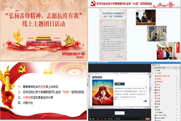 弘扬雷锋精神,强化青春责任勇担——积极宣传青年学子抗疫事迹。自疫情发生以来,学院广大青年团员积极响应上级党组织和团组织的号召,在做好自我防护的同时,在关键时刻挺身而出,用实际行动助力防“疫”,积极投身于家乡疫情防控志愿服务工作,将弘扬和践行雷锋精神融入抗“疫”工作,为打赢疫情防控阻击战贡献青春力量。学院累计有30余名青年志愿者,在全国各地的社区街道、村委会、青年志愿服务点等地,开展疫情防控志愿服务工作,部分同学主动捐款捐物,涌现出吴修佳捐款8000元国家奖学金、孟令孜海外向母校捐赠口罩、金邺诚志愿服务160小时不停歇等先进典型。学院统一部署,积极组织学院志愿者们参与各班团主题班会,开展“志愿抗疫有我”经历分享会,用自身实践体会,现身说法,讲述抗“疫”过程中的身边人身边事。