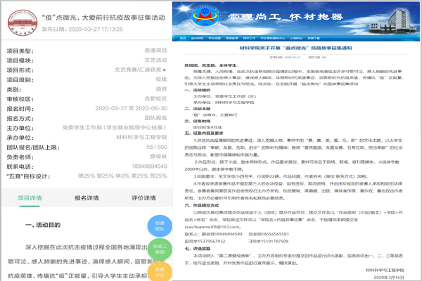 传承雷锋精神,讲述新时代雷锋故事——积极开展抗疫微故事征集活动。威尼斯9499登录入口依托第二课堂平台,在全院学生中深入开展“益点微光,大爱前行”抗疫微故事征集活动,鼓励学生在疫情期间讲述抗击疫情的先进事迹,深入挖掘人物、事件中的“真、善、美、爱、乐、新”的文化主题,以大学生的视角诠释“奉献、友爱、互助、进步”的新时代精神,宣扬“爱党爱国、友爱友善、互帮互助、担当奉献”的社会责任与担当,讲述新时代雷锋故事,体悟新时代英雄事迹,讴歌新时代抗疫英雄,传播抗“疫”正能量,活动开展过程中已有近200名同学报名参加。