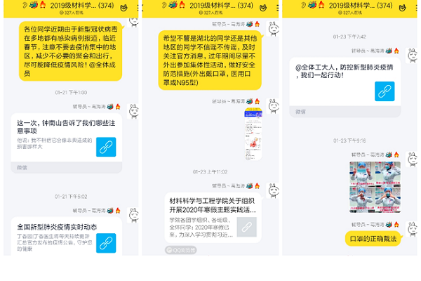 言传身教,知行合一,做好非常时期的思想引领。自新型冠状病毒感染的肺炎疫情发生以来,学院辅导员们充分调动党支部、团支部的力量,利用学习强国、网上直播、QQ直播、QQ群等平台,及时传达习近平总书记对当前新型冠状病毒感染肺炎防控工作作出的一系列重要指示精神,以及教育部、安徽省和学校关于疫情防控的政策以及工作要求,积极关注疫情防控进展,保证了学习不断线,进一步增强了疫情期间党团组织的思想引领作用。部分青年积极响应号召,充分发挥“一个支部就是一个堡垒,一名党员就是一面旗帜”的战斗堡垒和先锋模范作用,积极投身志愿服务,冲锋在疫情防控第一线,让党旗、团旗在防控疫情斗争第一线高高飘扬!材料物理2018-1班学生党员周霆宇、材料成型及控制工程17-1班学生党员杜黎明、材料类19-6班团员贺景浩、材料类19-4班钱璟,积极参与到社区防疫工作中;2019级材料类专业积极组织线上零星捐款,其中材料类19-3班何展辉个人捐款1100元。志愿者们均表示危难当头,愿意贡献自己的绵薄之力,同祖国共渡难关。