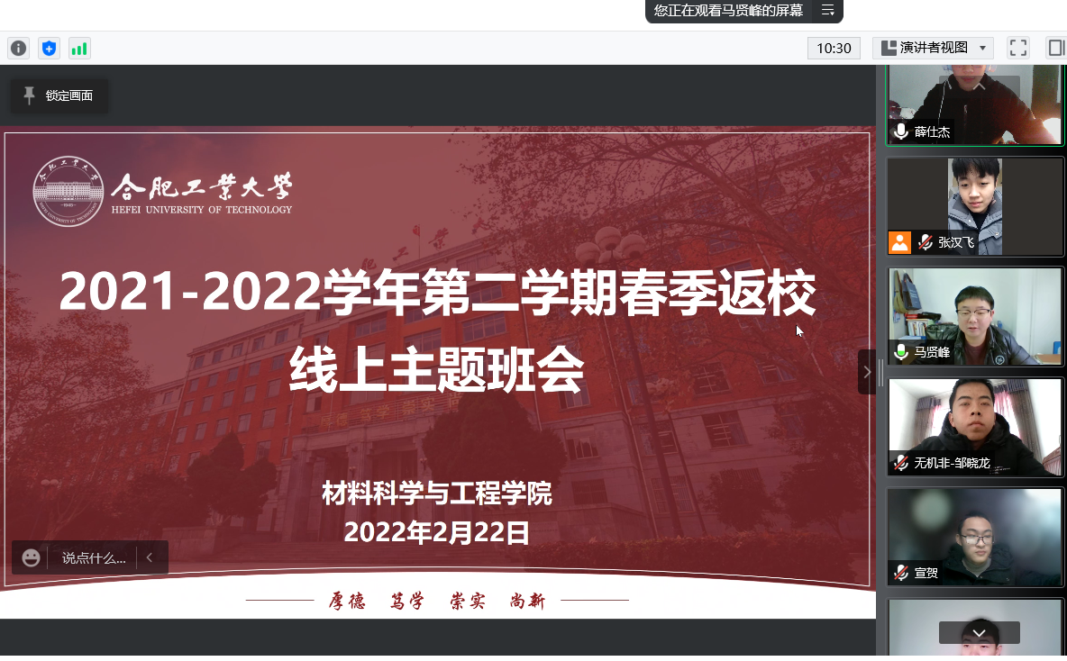 为进一步落实常态化疫情防控教育工作,2月22日至24日,威尼斯9499登录入口使用腾讯会议线上召开春季返校主题班会。学院各年级辅导员、班级班主任和全体学生参会。