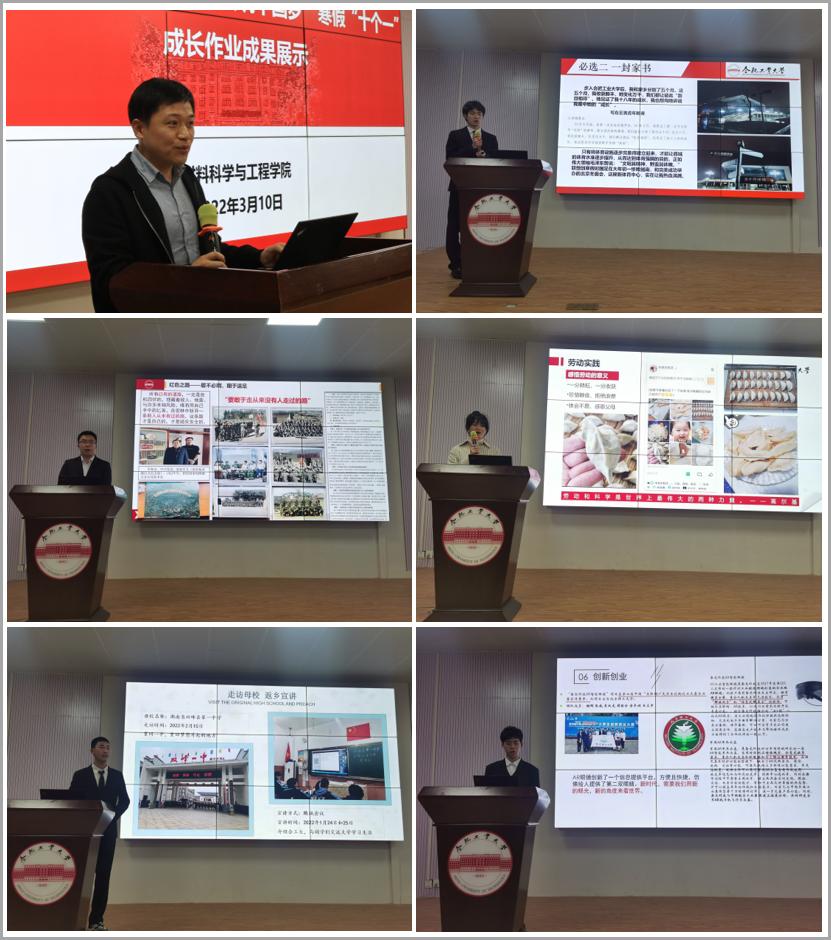 开学初,学院以班级为单位开展了寒假“十个一”成长作业主题分享会,有人实地走访党员,见证初心故事;有人书写家书,激发家国情怀;有人宣讲工大故事,奉献青春锻造自我。经团支部推荐共有25位同学参与了学院汇报展示。材料类21-3班的周泽宇同学以“成长之行,报国之心”为主题,从返乡造访高中、寻访党员、学习雷锋精神、撰写家书等方面展示了他的寒假作业成果;21-7班的贺乐平同学则以“我与伟人,同走来时路”为主题,讲述了走访毛泽东主席故居的经历;21-6班的黄彦涛同学以“奋斗因使命,实践映初心”为主题,讲述了寒假期间完成的八项作业。