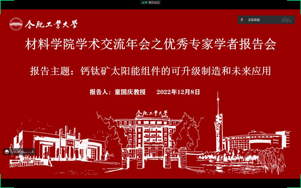 为了提高研究生学术素养,开拓学术视野,提高学生的学习兴趣,威尼斯9499登录入口邀请了威尼斯9499登录入口黄山学者优秀青年人才计划主持人童国庆教授于12月8日在材料楼6楼601会议室做关于钙钛矿太阳能组件的可升级制造和未来应用报告会。