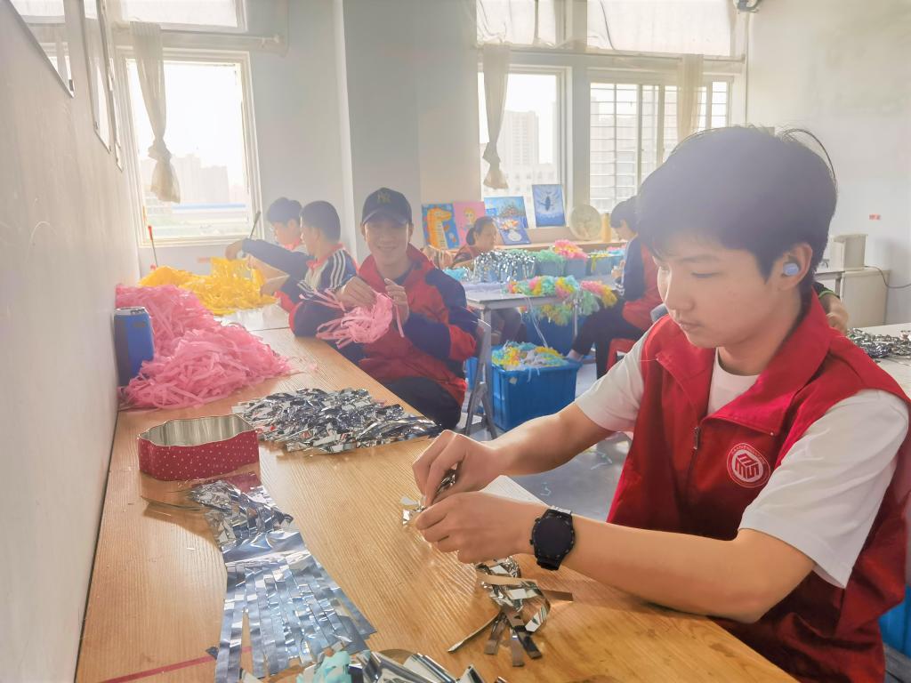 活动期间,在工坊老师的指导下,志愿者协助残障人士进行手工制作,将材料折叠后用细绳连接制作为彩条,可用于联欢会等场合进行场景布置。志愿者们快速投入到工作当中,协助员工进行制作,并负责对残障人士制作的产品进行检查,确保合格后方可通过。制作过程中,志愿者们和工坊员工进行交流,为残障人士增加沟通机会,帮助他们更好地融入社会,并与他们交流各自兴趣爱好,互相了解生活现状,志愿者们也积极分享自己的大学生活感受,交谈过程轻松愉快。