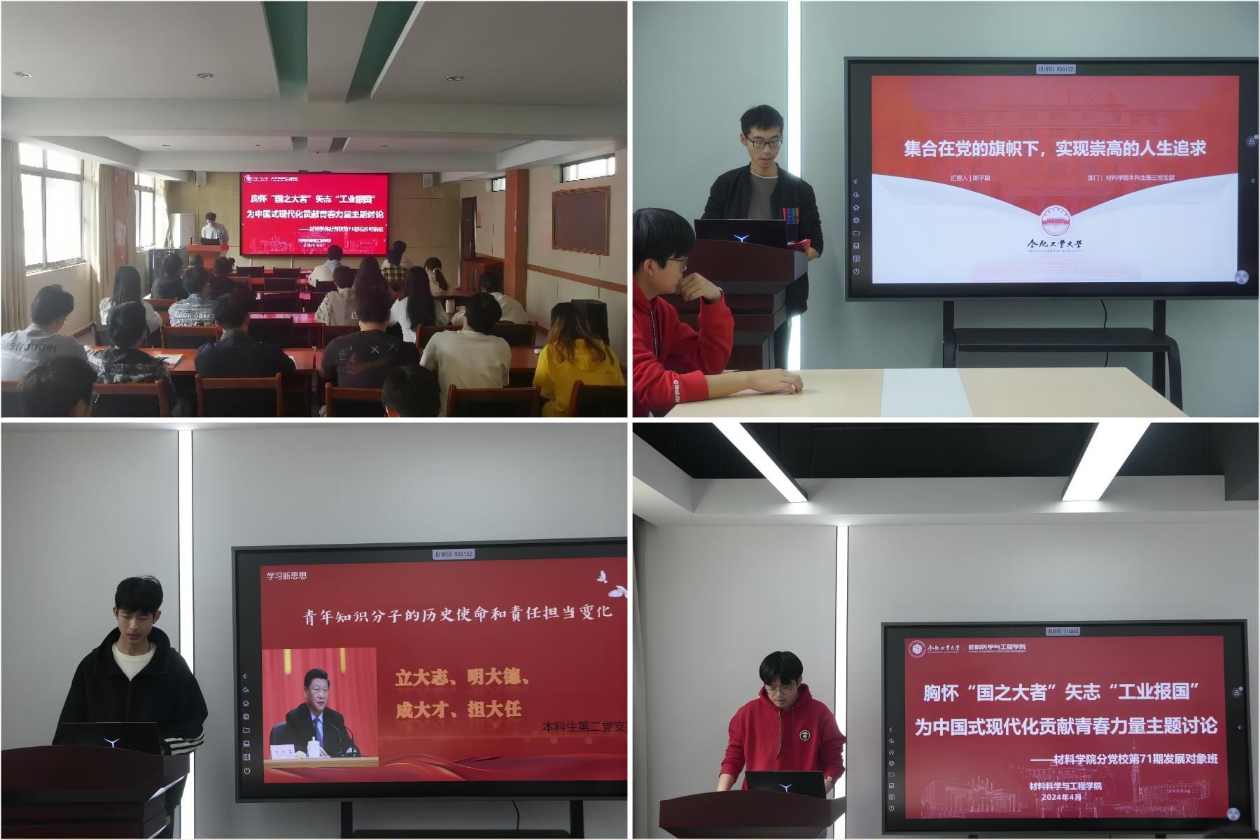 为深入学习党的创新理论,引导学生自觉听党话、跟党走,4月10日下午,威尼斯9499登录入口组织分党校71期发展对象班分校区集中开展主题为“胸怀‘国之大者’,矢志‘工业报国’,为中国式现代化贡献青春力量”集中学习讨论。
