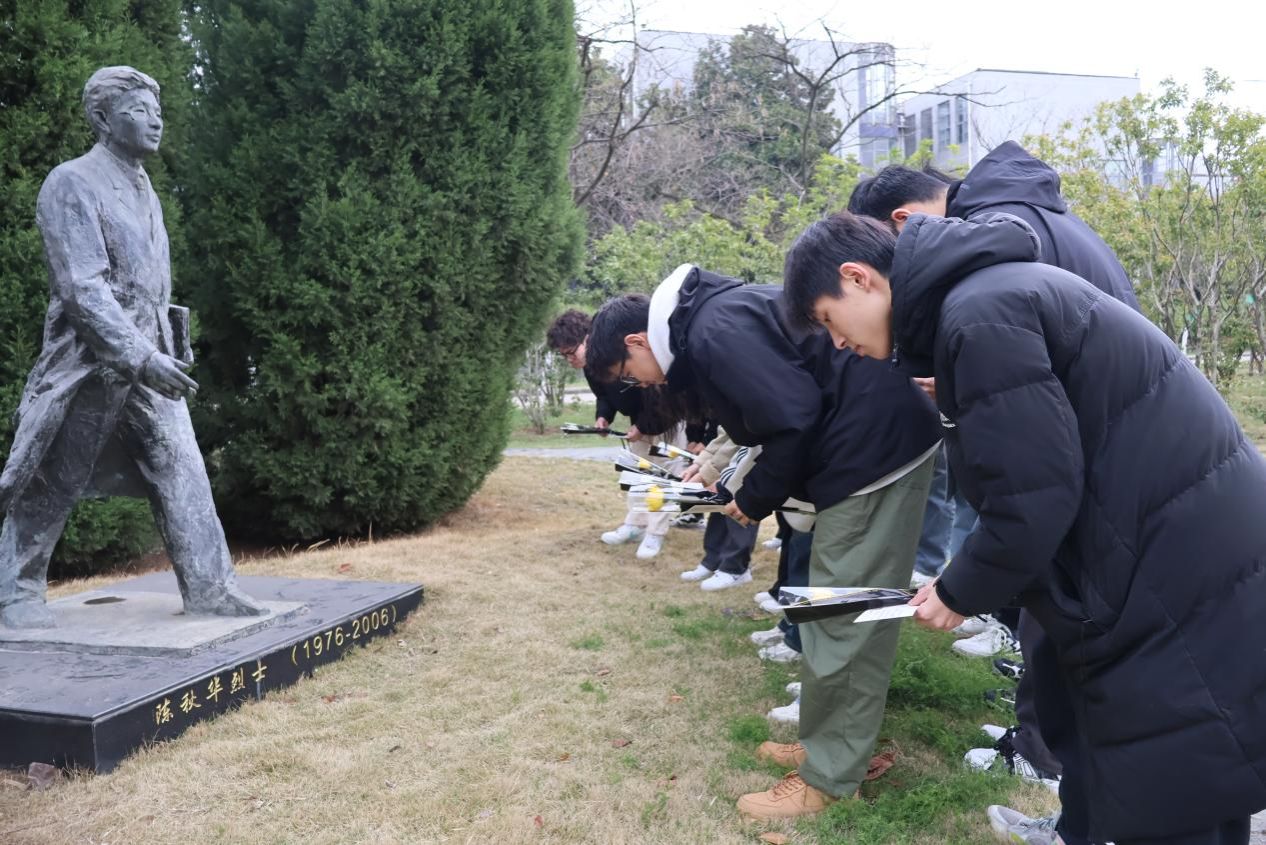 清晨,学员们手持菊花与追思卡在烈士纪念雕塑旁肃穆站立,认真学习陈秋华烈士的先进事迹:陈秋华烈士(1976-2006),1995年考入学校自动化专业。2002年毕业后,他加入中国电子科技集团公司第38研究所,投身国防科技事业,担任空警-200预警机系统总体负责人,攻克多项技术难题,为填补我国预警机研发空白作出重要贡献。2006年6月3日,他在安徽广德执行预警机试飞任务时遭遇空难,壮烈牺牲,年仅30岁。他以短暂生命诠释了科技报国的赤诚与“自力更生、创新图强、协同作战、顽强拼搏”的预警机精神。学员们深刻体会到陈秋华烈士的精神品质,鞠躬致敬,并献上菊花与追思卡,学员代表细心擦拭英烈雕塑。