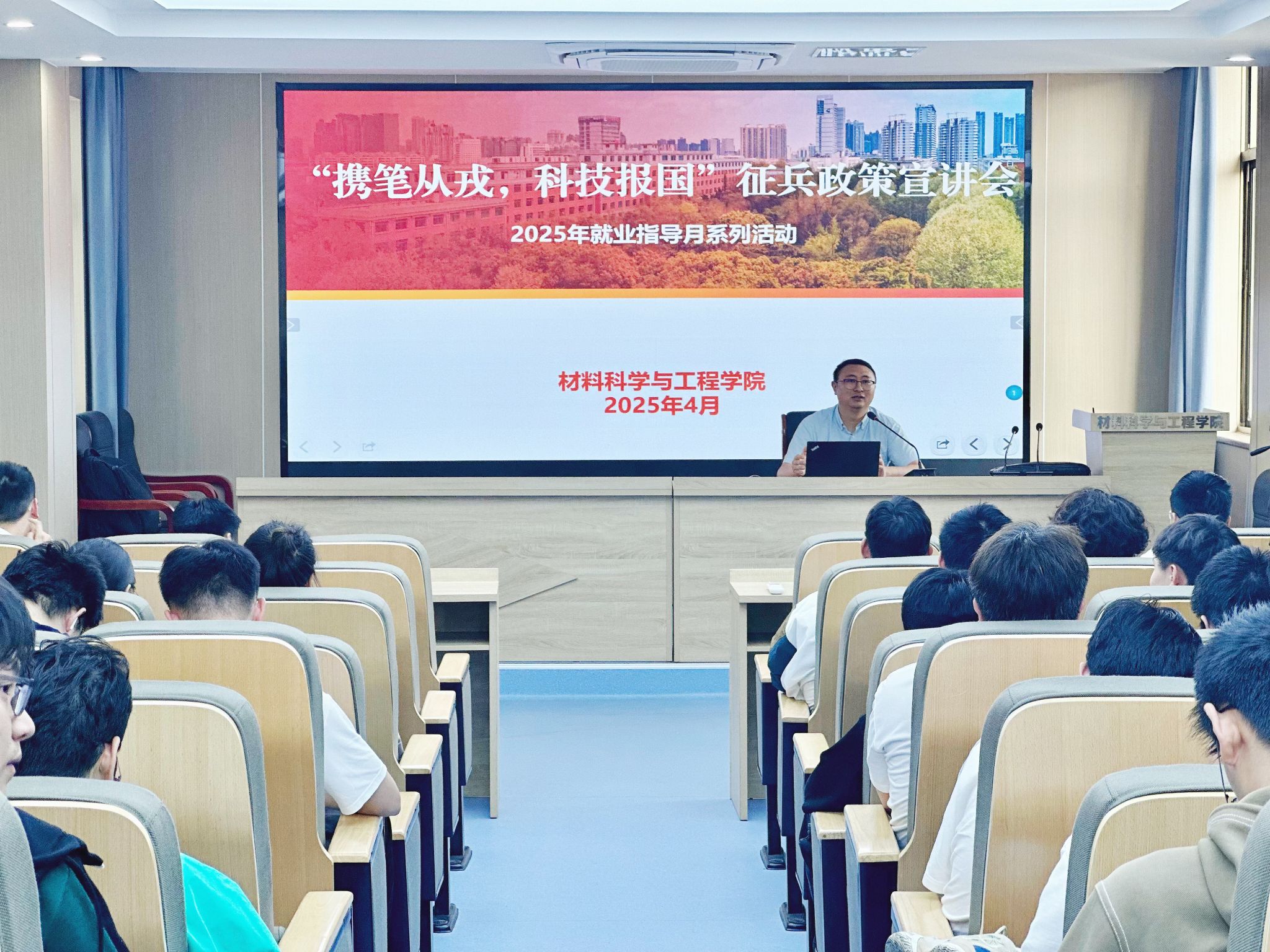 为积极响应国家征兵号召,鼓励青年学子投身军营、报效祖国,做好2026届毕业生征兵宣传工作,4月18日下午,威尼斯9499登录入口于材料楼601举办“携笔从戎,科技报国”征兵政策宣讲会。学院70余名学生参与活动。