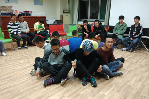 这次团体辅导活动有 “背起对立”与“压力雕塑”两个环节。活动开始,在主持人林新婷同学的指引下,同学们试着以“背对背,手拉手”的方式站起来。该活动不仅考验了同学们的平衡技巧,同时表现了是同学之间的默契与团结。“压力雕塑”环节,参与同学通过将自己的压力通过橡皮泥雕塑具象化,并亲手摔碎,更具体地认识自己,直面自己的压力并勇敢克服。